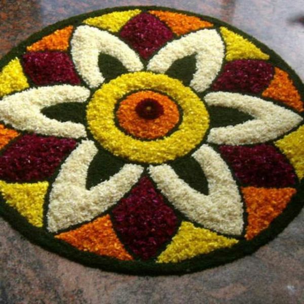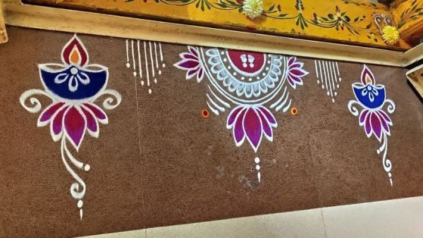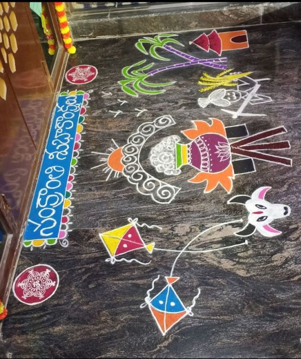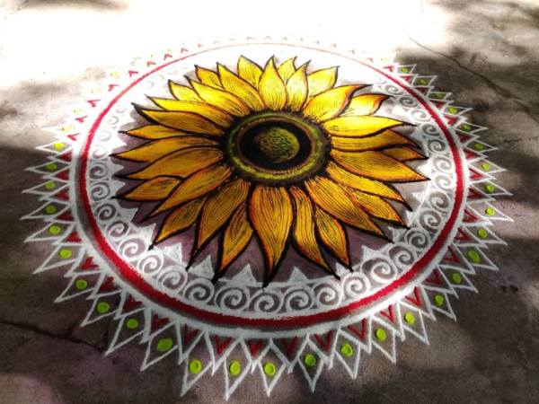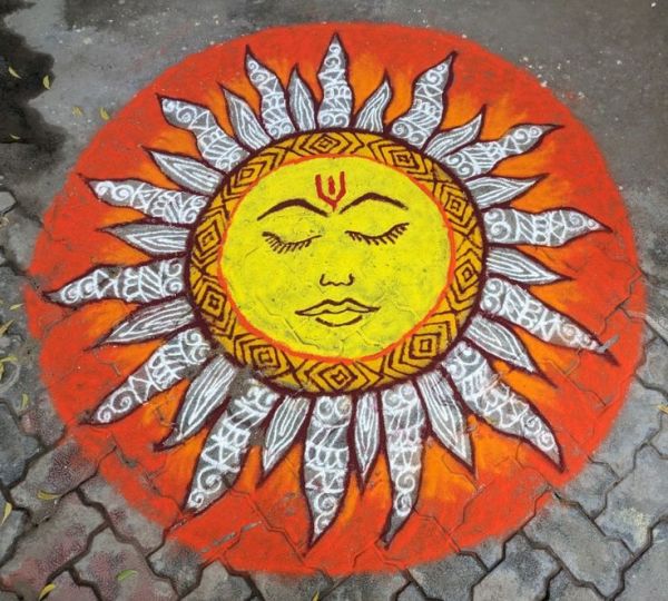 Clean lines and triangles form a frame around a central sun motif, emphasising negative space with earth tones. Quick to draw freehand, it fits small homes perfectly. This modern Pongal kolam for Kannum Pongal 2026 offers elegance without fuss, ideal for busy festival mornings.