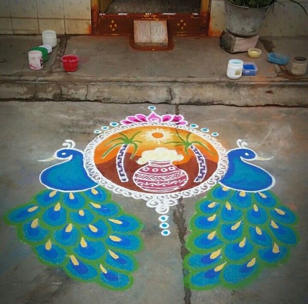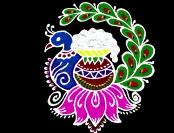 Elaborate peacock with fanned feathers in ombre blues-greens frames harvest symbols like cows and crops. Use coloured powders for eye-catching sheen; simple curves make it accessible. Symbolising grace for Kannum Pongal, it dazzles doorsteps and embodies Pongal rangoli designs 2026 vibrancy.