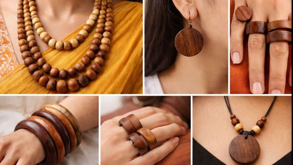 Wooden Jewelery Designs: Leave gold and silver and try wooden jewellery, get a natural look on cotton saree. Wooden Jewelery Designs For Women Ethnic Cotton Saree Accessories Necklace Earrings Bangles Rings