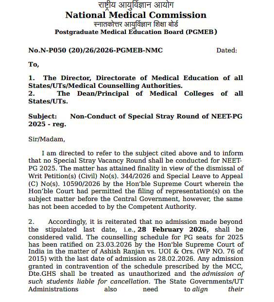 New Delhi: The National Medical Commission (NMC) has officially released a notification stating that no Special Stray Vacancy Round will be conducted for NEET-PG 2025 admissions. The decision was communicated through a notification issued by the Postgraduate Medical Education Board (PGMEB).