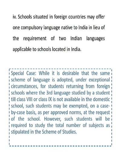 CBSE has relaxed language norms for overseas schools, allowing one compulsory Indian language instead of two under its new curriculum framework. The Board has also introduced case-by-case exemptions for students returning to India.
