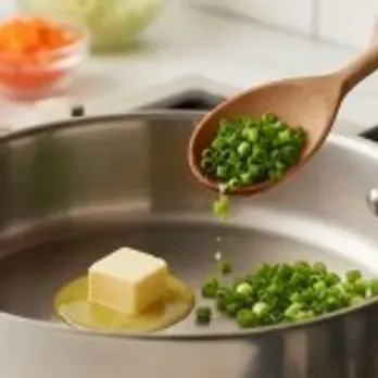 Melt butter or olive oil in a saucepan. Add green onion and fry while stirring continuously until it becomes soft.