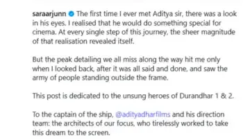 Sara began her note by recalling her first meeting with director Aditya Dhar, describing a moment that left a lasting impression on her. She wrote about recognising early on that he was destined to create something special for cinema. Looking back at the journey, she wrote how the scale and ambition of the project became increasingly evident with time.