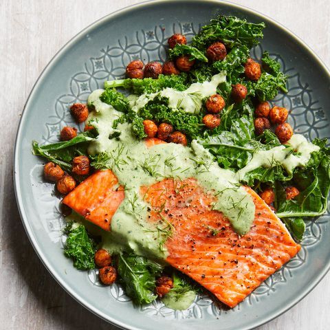 In this healthy salmon dinner, you'll get a dose of greens and green dressing! Chowing down on 6 or more servings of dark leafy greens a week can help keep your brain in top shape. This dish features the Test Kitchen's current go-to method for doctoring a can of chickpeas: spice them up and roast until crispy.