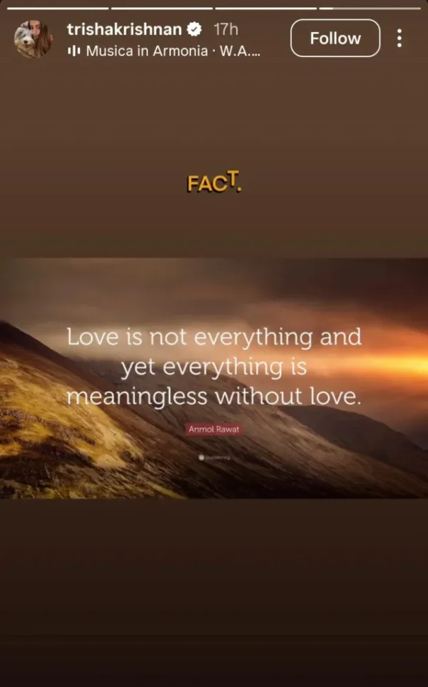 Amid these rumors, Trisha shared a couple of mysterious posts on social media that caught everyone’s attention. One of her posts read, “Love is not everything, and yet everything is meaningless without love,” which she called a “Fact.” She also shared another message highlighting the importance of peace and silence, suggesting that staying calm is better than arguing with people who refuse to understand.