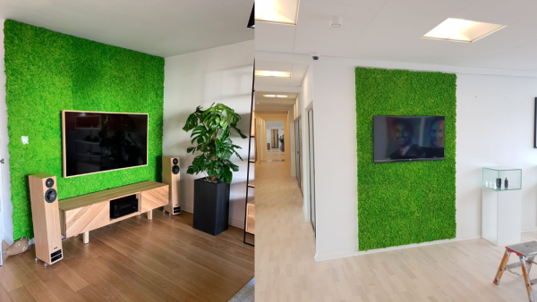 To make your living room wall stand out, try an artificial grass panel. You can cover one wall completely and install small wooden open shelves for your showpieces, books, or small pots. Throw in a comfy single-seater sofa, and you've got a perfect corner that feels like it's straight out of a luxury resort.