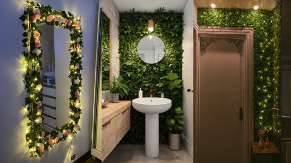 Washbasin Area MakeoverThe walls near washbasins, whether in the bathroom or the hall, often get damaged by dampness. Instead of spending a bomb on repairs, just cover the area with artificial grass. Add some LED strip lights, and it will look modern and chic.
