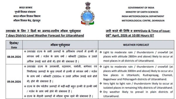 As per the forecast made public by the IMD on April 8, light to moderate rainfall with thunderstorms is predicted for most districts of Uttarakhand on April 8. Snowfall is predicted at places higher than 2800 meters above sea level. This weather phenomenon will affect all the districts in the region.