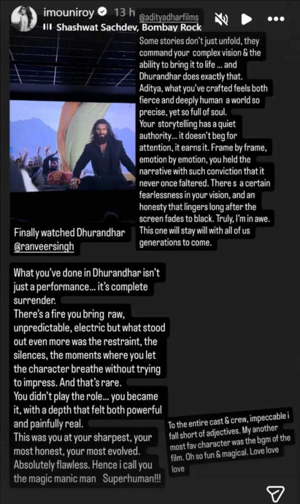 Mouni Roy reviews 'Dhurandhar: The Revenge'Mouni Roy took to her Instagram Stories to share her review about 'Dhurandhar: The Revenge'. She wrote, "@adityadharfilms, some stories don't just unfold; they command your complex vision & the ability to bring it to life... and Dhurandhar does exactly that. Aditya, what you've crafted feels both fierce and deeply human, a world so precise yet so full of soul. Your storytelling has a quiet authority... it doesn't beg for attention; it earns it."
