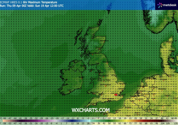 The UK could again bask in hot weather again later this month, with weather maps suggesting temperatures could again soar to 21C. The latest maps from WXCharts are showing another 'mini-heatwave' for Sunday, April 19, and Monday, April 20.