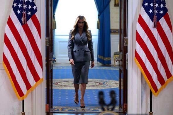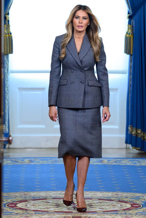 As the cameras rolled, a first sign picked up by Ms James was when Melania made her way to the podium with an entrance walk that was very different from her normal style. Ms James observed: "Her entrance walk is almost a march as opposed to her normal, elegant 'catwalk' style. Her severe grey suit with its sharp tailoring and padded shoulders give a look reminiscent of her 'boardroom' pose of her official White House portrait, suggesting a desire to appear firm and businesslike."