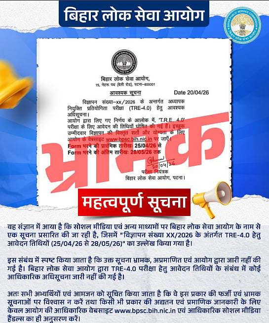 The Bihar Public Service Commission (BPSC) has released a clarification on its social media handle X stating that a notification circulating online regarding the Teacher Recruitment Examination (TRE 4.0) 2026 is “misleading and unverified.”