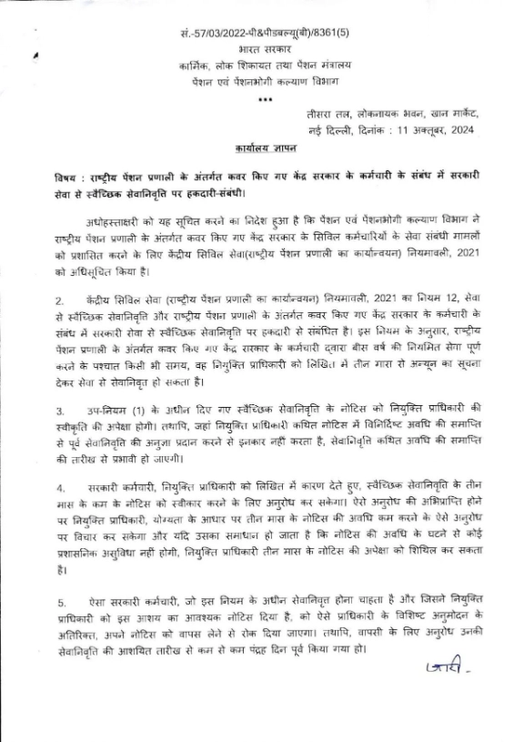 The Department of Pension and Pensioners Welfare (DoPPW) of the Government of India has issued a guideline related to the rights of central employees who choose voluntary retirement (VRS) under the National Pension System (NPS). Through an office memorandum issued on October 11 this month, the department has notified the Central Civil Services (Implementation of National Pension System) Rules, 2021 for service-related matters of central government personnel covered under NPS. This decision will benefit those central government employees who want to take voluntary retirement i.e. VRS. This rule determines the service conditions and pension rights for employees covered under NPS.
