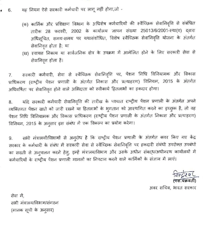 Department of Pension and Pensioners Welfare, Government of India has clarified that after 20 years of service, central employees covered under the National Pension System can opt for VRS by giving three months’ notice.