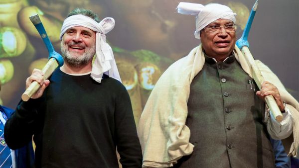 Spade on shoulder, towel on forehead, smile on face, desi look of Rahul-Kharge in MNREGA Bachao. Mgnrega Controversy Congress Attack Kharge Rahul Gandhi On Vbgramg Bill