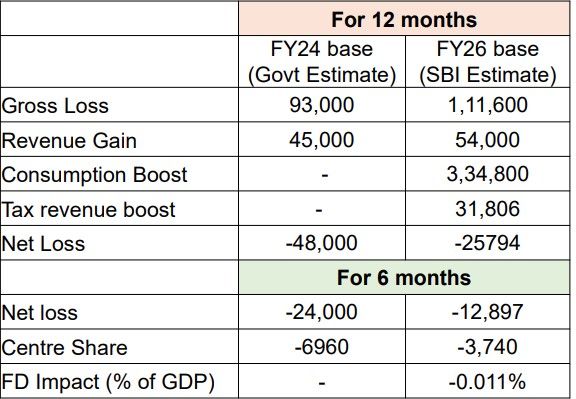 For FY26, SBI estimates the gross revenue loss to be higher at Rs 1.11 lakh crore. But with strong consumption trends and higher tax revenue, the net loss is projected to decline sharply to Rs 25,794 crore for the full FY26 including centre and states share.