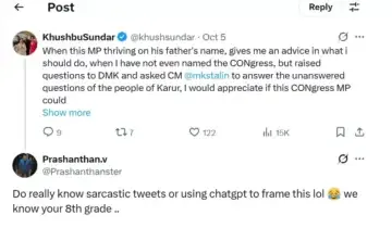 Khushbu, a while back, took to X to slam a user who wrote, "Do you really know sarcastic tweets or using ChatGPT to frame this? lol we know your 8th grade." Her tweets were questioned related to her intelligence. This happened after Khushbu reportedly made a political tweet on X and the troller slammed her for using Chat GPT for making 'sarcastic tweets'. Khushbu, in a stern manner, replied: