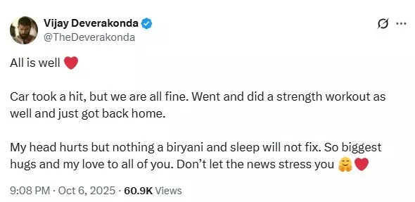 Now, the actor shared an update on his social media platform. Taking to his X account, he wrote, "All is well. The car took a hit, but we are all fine. Went and did a strength workout as well, and just got back home. My head hurts, but nothing a biryani and sleep will not fix. So, the biggest hugs and my love to all of you. Don’t let the news stress you."
