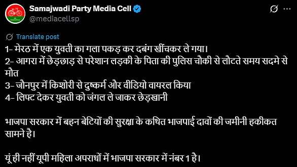 It added that claims of women’s protection in Uttar Pradesh stand exposed as the state continues to rank among the highest in crimes against women.