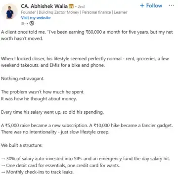 "Every time his salary went up, so did his spending. A Rs 5,000 raise became a new subscription. A Rs 10,000 hike became a fancier gadget. There was no intentionality-just slow lifestyle creep," said Walia.
