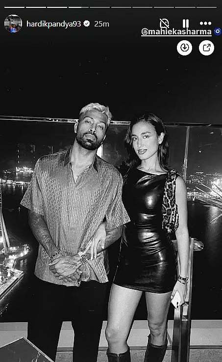 The couple, currently on a tropical vacation to celebrate Hardik’s 32nd birthday (October 11), looked relaxed and affectionate. Hardik sported a printed black jacket and shorts, while Mahieka kept it casual in a crisp white shirt.