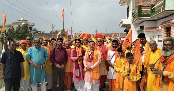 Flowers showered with the echo of conch sound in the grand Kalash Yatra regarding Shrimad Bhagwat Katha. Loyalty to God with a pure heart is virtuous – Shri Raghav Ramanujadas.
