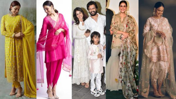 True to her cheerful personality, Genelia once wore a bright fuchsia-pink kurta set from Devnaagari featuring delicate embroidery and golden detailing. She paired it with dhoti-style pants and a matching sheer-net dupatta with playful tassels, a look that was as fun and fabulous as she is.
