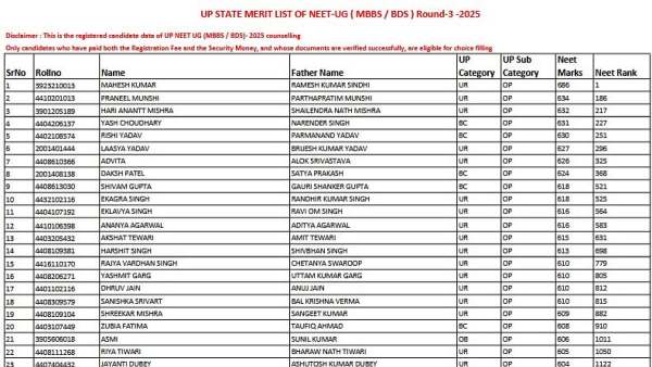 UP NEET 2025 Round 3: Revised State Merit List Out, 34,511 Students Eligible For Counselling; Choice Filling From October 17