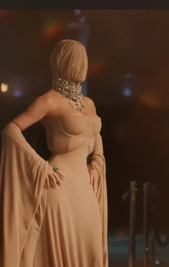 Kim, known for her signature style and red-carpet looks, once again stunned everyone with her dramatic appearance, wearing a beige-coloured outfit with her face fully covered. What added glam to her look was a large necklace and emerald rings.