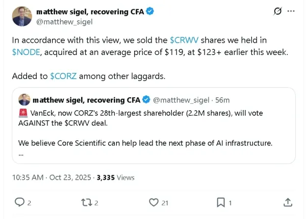 Matthew Sigel, head of digital assets research at VanEck, said Thursday that the firm now owns 2.2 million shares of Core Scientific (CORZ) and will vote against the company’s planned merger with CoreWeave (CRWV).