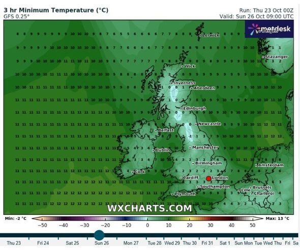 The North of England will wake up to the coldest conditions on Sunday, November 26, with lows of -1C forecast between North Yorkshire and Cumbria. The majority of England will feel chilly, with temperatures dipping below 4C across the length of the country at 9am. The south will sit between 2-3C and the north of England will range from below zero to 1C, according to weather maps by WXCharts.