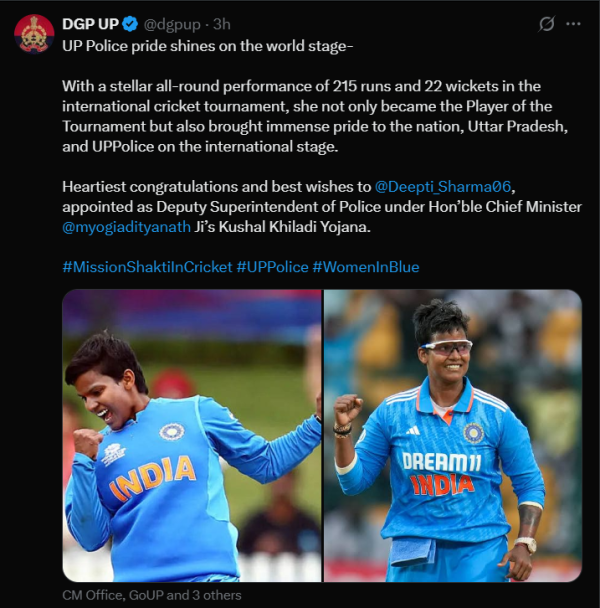 “Uttar Pradesh Police's Pride on the Global Stage! In the international cricket tournament, Deepti Sharma delivered an outstanding performance with 215 runs and 22 wickets, earning her the Player of the Tournament award — bringing pride to the entire country, state, and Uttar Pradesh Police on the international stage. Heartfelt congratulations and best wishes to @Deepti_Sharma06, appointed as Deputy Superintendent of Police under the sports quota as part of Hon'ble Chief Minister @myogiadityanath Ji's Skilled Athlete Scheme!”