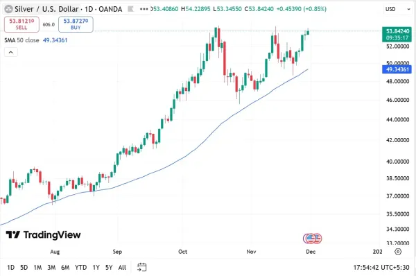 Spot silver (XAG/USD) is heading for its fifth straight session of gains, with prices climbing to around $54.30 per ounce on Friday, just shy of the record high of about $54.50 reached on October 17.
