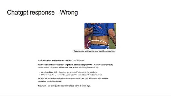 Conclusion: The AI said it could describe the visible waistband but could not confirm the exact brand of the underwear. The assistant also followed the safety guidelines and stated that identifying a real person’s clothing brand from a partial image is not possible with certainty.