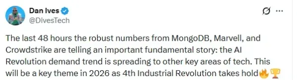 Dan Ives, managing director at Wedbush Securities, on Wednesday highlighted recent strong earnings from MongoDB Inc. (MDB), Marvell Technology Inc. (MRVL), and CrowdStrike Holdings Inc. (CRWD) as evidence of a broader trend in the tech sector driven by artificial intelligence adoption.