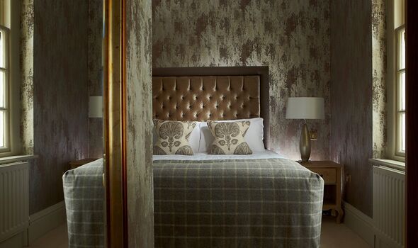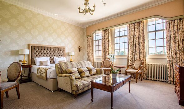We stayed in the feature suite, a large, ornate room with grand, textured wallpaper and a stunning view of the hotel's pruned grounds.