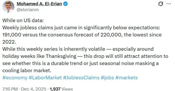 Mohamed El-Erian, Chief Economic Advisor at Allianz, noted in a post on X that despite its volatile nature, this drop will “still attract attention to see whether this is a durable trend or just seasonal noise masking a cooling labor market.”