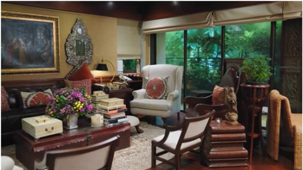 The den is a standout space, designed with a European flair. It features dark wooden furniture, leather sofas, soft lighting, and a vintage wooden table. Golden side lamps and silver artefacts complement a huge wall painting, creating a cozy, sophisticated space where Anil Kapoor enjoys his leisure time.