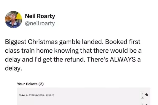 On Christmas Eve, one man shared a thread on X celebrating what he called his “biggest Christmas gamble.” Neil Roarty wrote: “Booked first class train home knowing that there would be a delay and I’d get the refund. There’s ALWAYS a delay.”