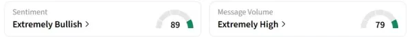 Retail sentiment on Stocktwits trended in the ‘extremely bullish’ territory at the time of writing, while message volumes were at ‘extremely high’ levels.