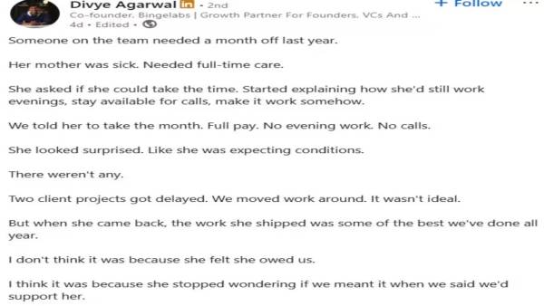 While companies are taking anti-employee measures in many parts of the world, a post shared by a founder is attracting everyone's attention. He told how he gave leave to one of his employees with one month's salary due to her mother's illness. The post also states that when she returned to work after a month, she started working with even more energy. Divya Aggarwal, co-founder of social media growth company Bingelabs, has shared this note on LinkedIn. He wrote, 'Last year, a team member needed a month's leave. His mother was ill and needed full-time care.