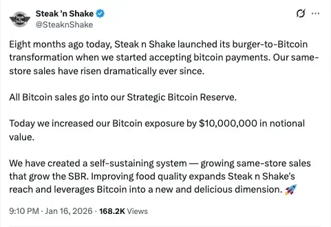 - The food chain reiterated that all Bitcoin payments go into its Strategic Bitcoin Reserve, after launching the reserve in late October.