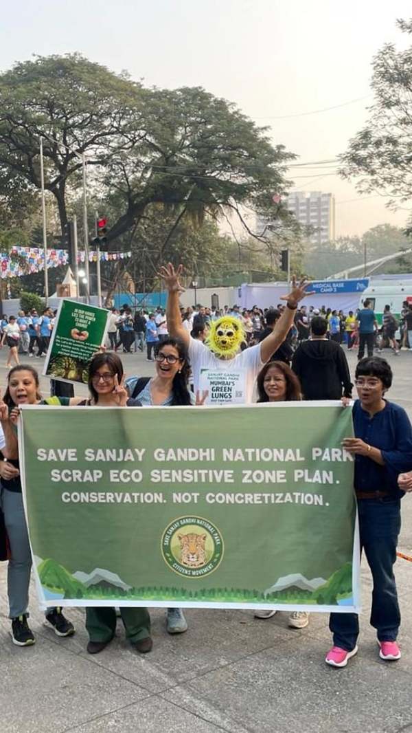 Beyond the race, participants highlight environmental issues during the Tata Mumbai Marathon.