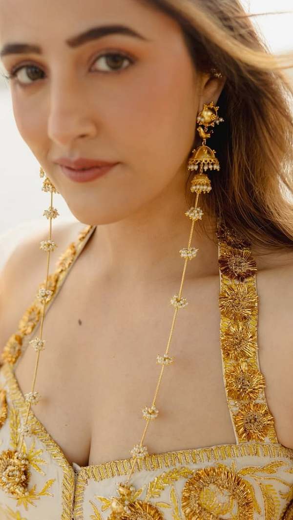 Nupur elevated the look with traditional gold jewellery, including statement jhumkas, a delicate maang tikka and a stunning haath phool