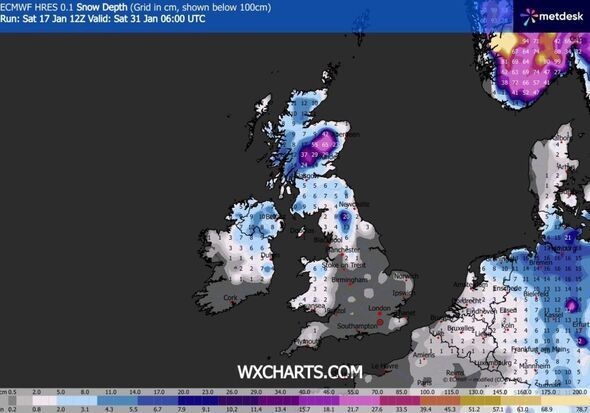 According to the data, the weather will accelerate in ferocity on January 31 before moving south in the early hours of February 1 until it eventually covers the vast majority of the UK. Scotland will see the bulk of the snow, with the Cairngorms National Park seeing 72cm settle at the weather front's peak. Elsewhere, the entirety of Northern Ireland and Wales will be hit by the weather, while only Hampshire and Cornwall will not turn white on the weather maps.