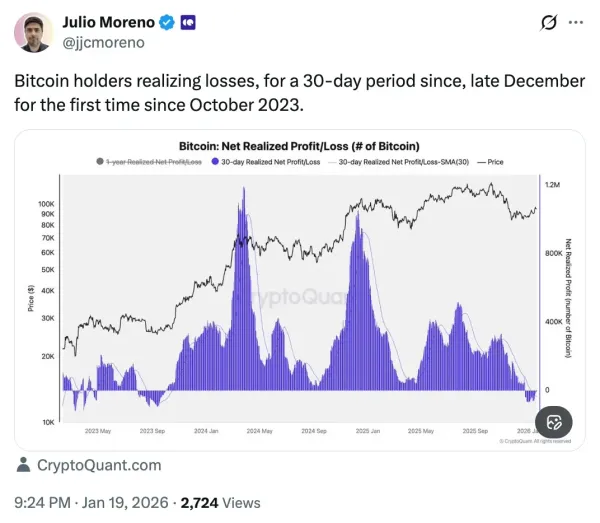 The current market movement comes as silver hit a record high of $94 per ounce, driven by geopolitical tensions such as the US-EU trade dispute over Greenland. Interestingly, on-chain data shared by Julio Moreno of CryptoQuant showed that Bitcoin holders are now realizing losses over the past 30 days for the first time since 2023. This signals short-term market stress.