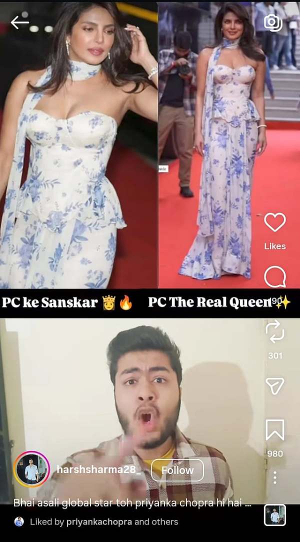 Actress Priyanka Chopra Jonas has found herself at the centre of a social media discussion after she liked a reel that compared her work ethic to that of Deepika Padukone. The Instagram reel, which has since gone viral, featured a content creator praising Priyanka while criticising Deepika.