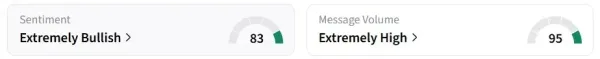 Retail sentiment on Stocktwits remained in the ‘extremely bullish’ territory amid ‘extremely high’ message volumes.