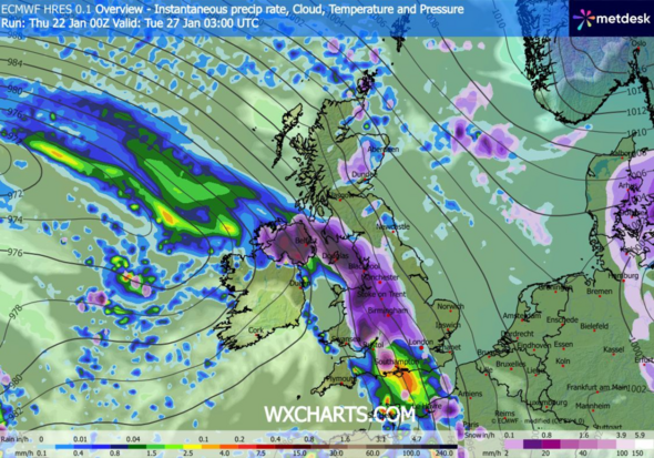Snow could soon be making its way back to the UK, according to brand new weather maps showing widespread snowfall and potential blizzard conditions, with up to 54mm an hour expected in some areas. The latest maps from forecaster WXCharts indicate that snow is set to begin falling from midnight on Tuesday, January 27, and continue for a whole 24 hours, with very few places forecast to be spared.