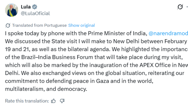 "I spoke today by phone with the Prime Minister of India, Narendra Modi. We discussed the State visit I will make to New Delhi between February 19 and 21, as well as the bilateral agenda. We highlighted the importance of the Brazil-India Business Forum that will take place during my visit, which will also be marked by the inauguration of the APEX Office in New Delhi. We also exchanged views on the global situation, reiterating our commitment to defending peace in Gaza and in the world, multilateralism, and democracy," President Lula wrote on X.